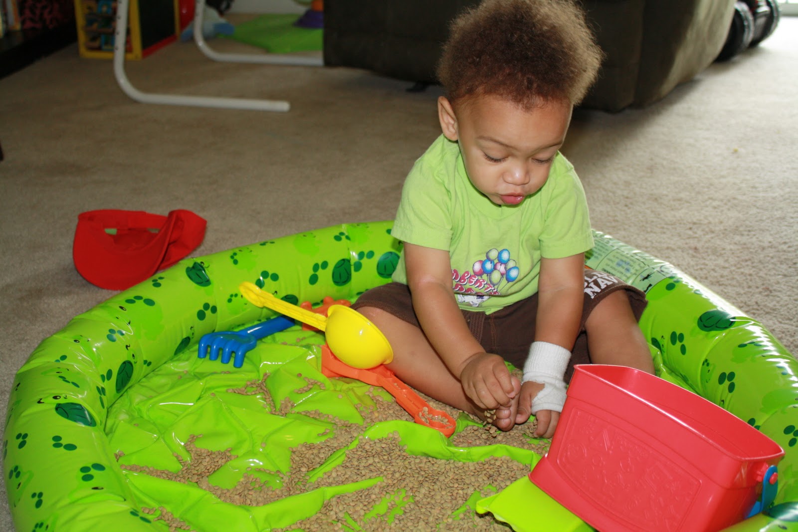 Filling up Silas kiddie pool with lentil beans, breaking out the beach toys, and letting him have at it!